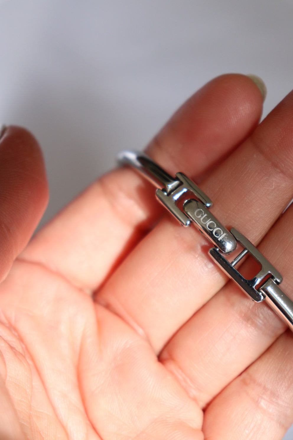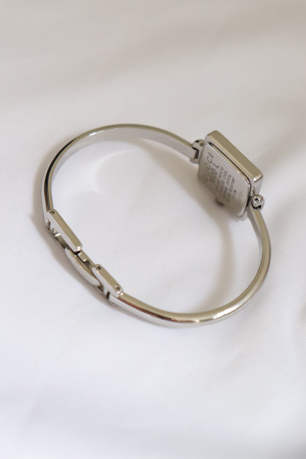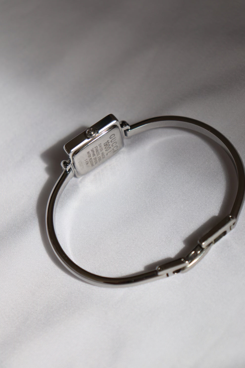 Timeless and sleek, this Gucci 1990L women’s wristwatch features a striking square stainless steel case, paired with a deep black dial and minimalist silver-tone hands and hour markers. The understated design and monochromatic palette reflect Gucci’s signature blend of elegance and modernity.