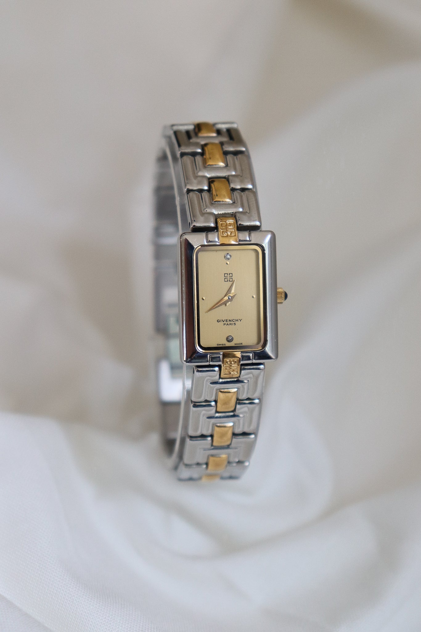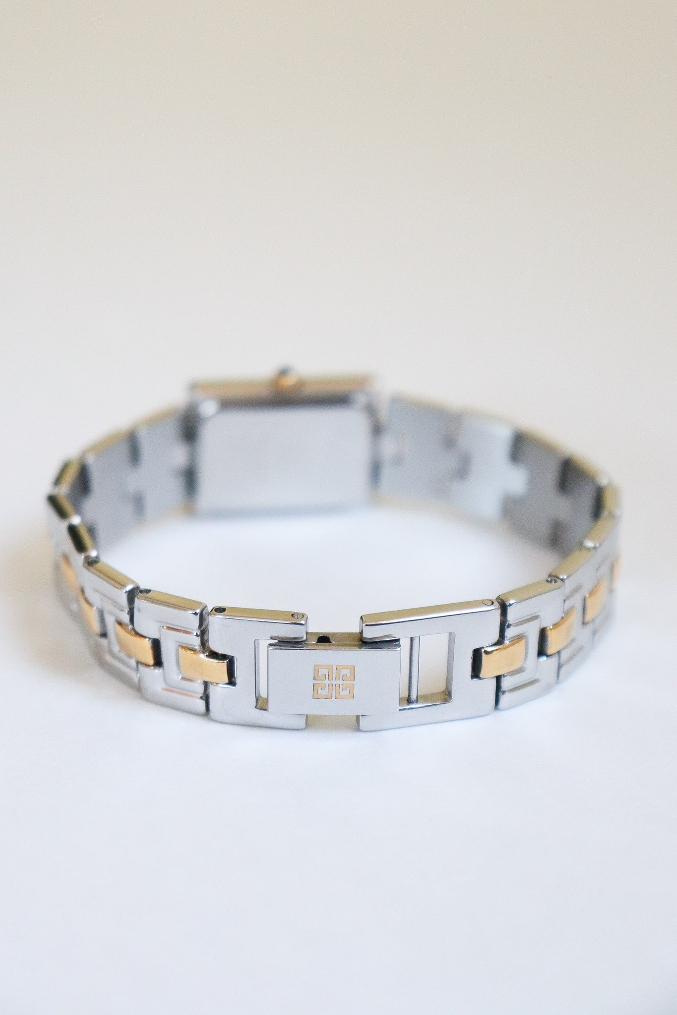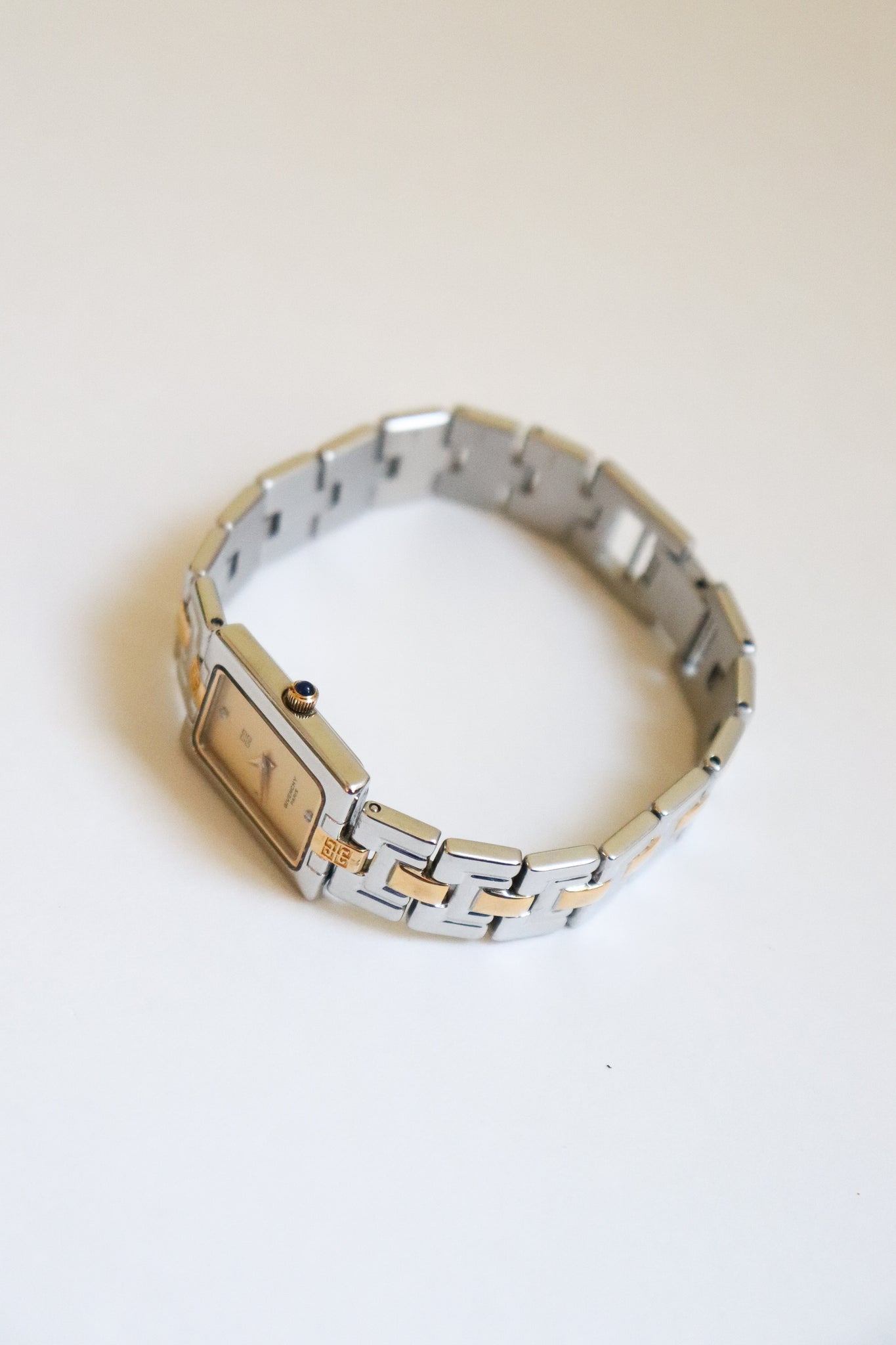 A versatile piece that transitions beautifully from day to night — wear it solo for a minimalist statement or stacked with your favorite bracelets for a touch of glam. This vintage Givenchy two-tone watch perfectly blends gold and silver for that effortless 90s elegance. The rectangular dial, accented with two sparkling crystals, gives it a refined yet modern edge.