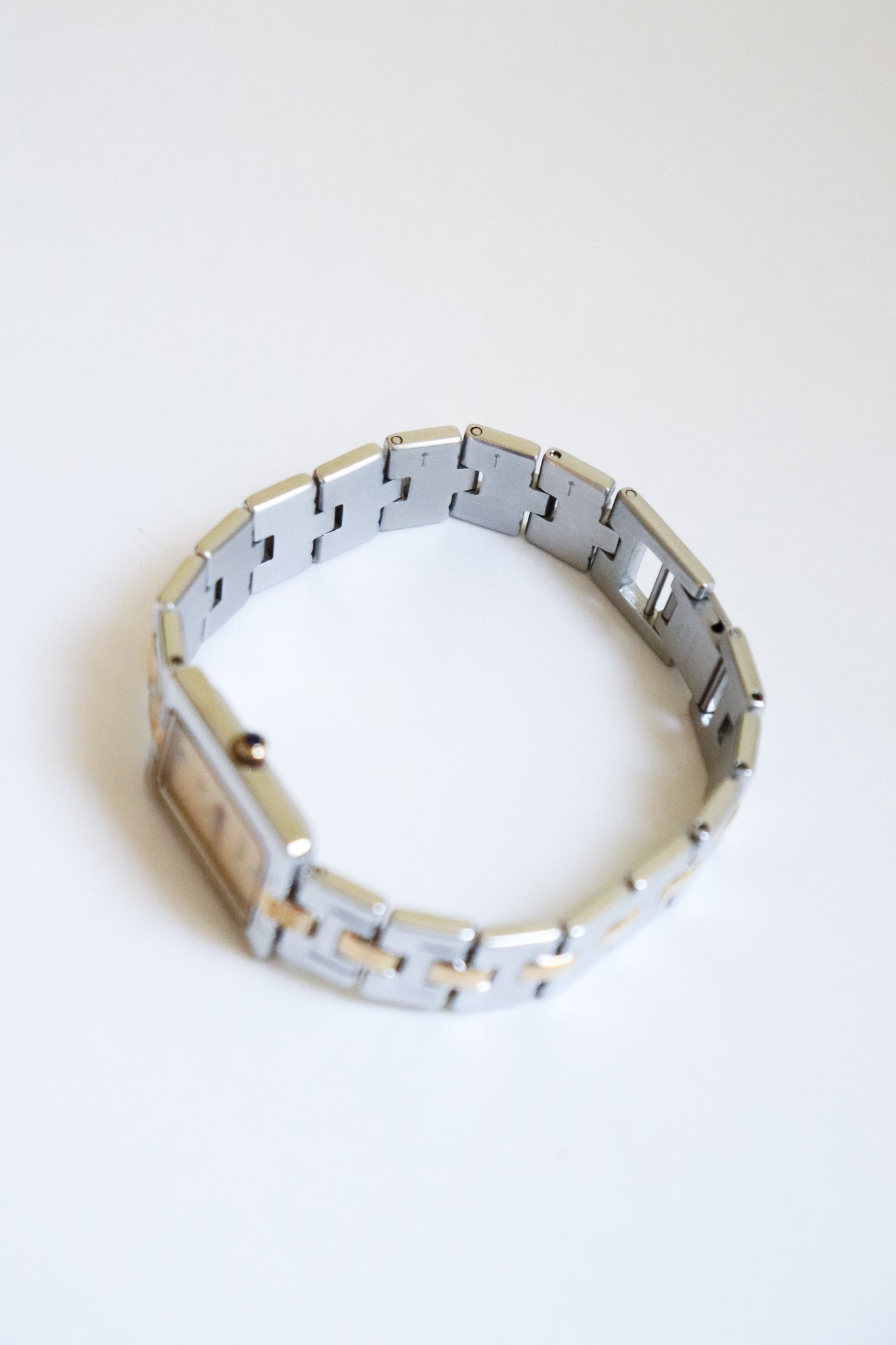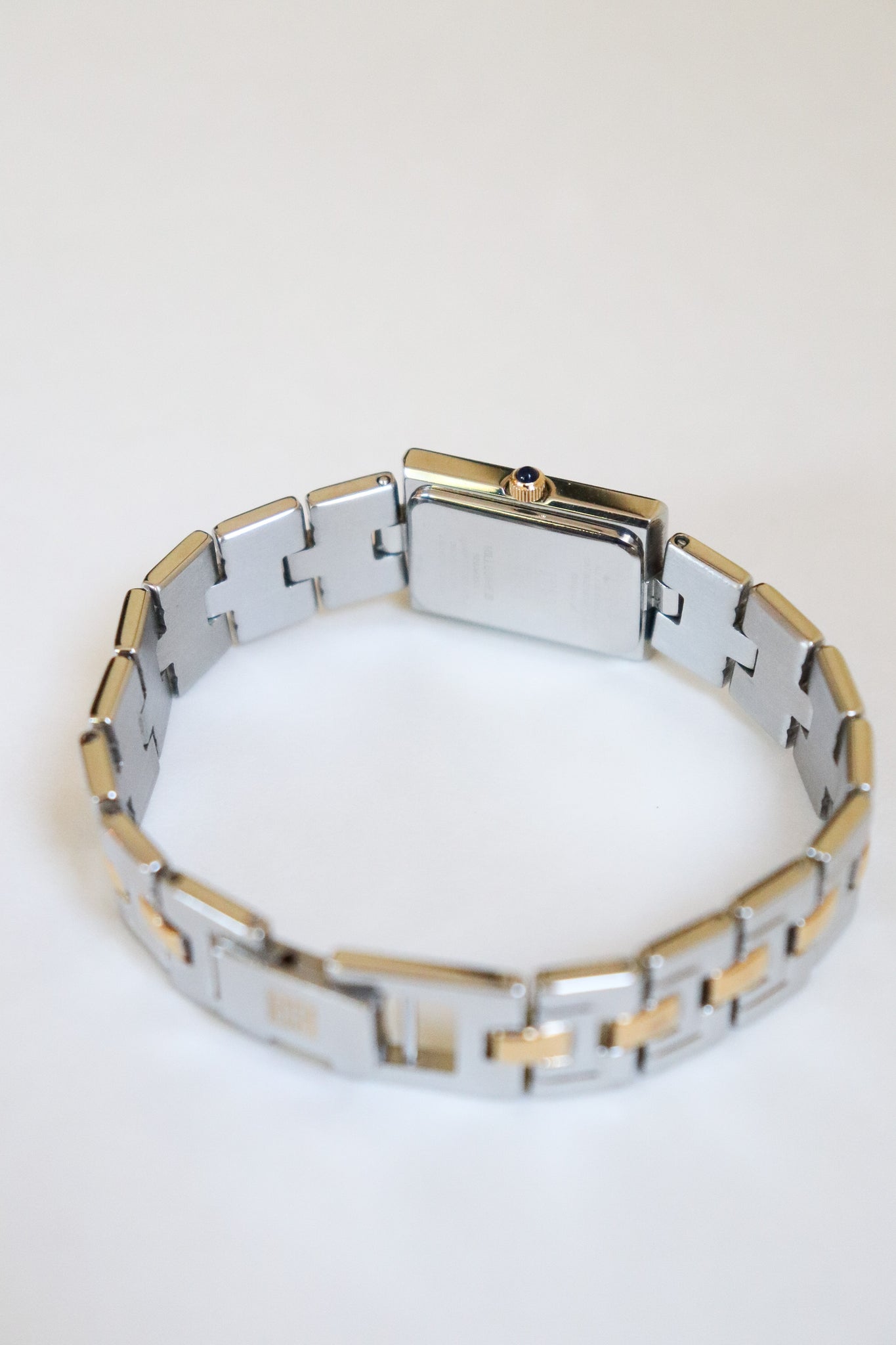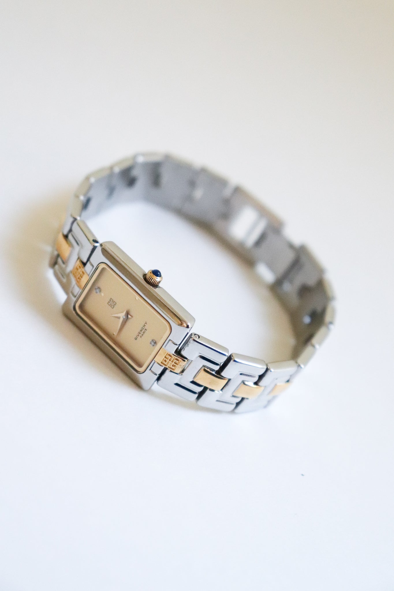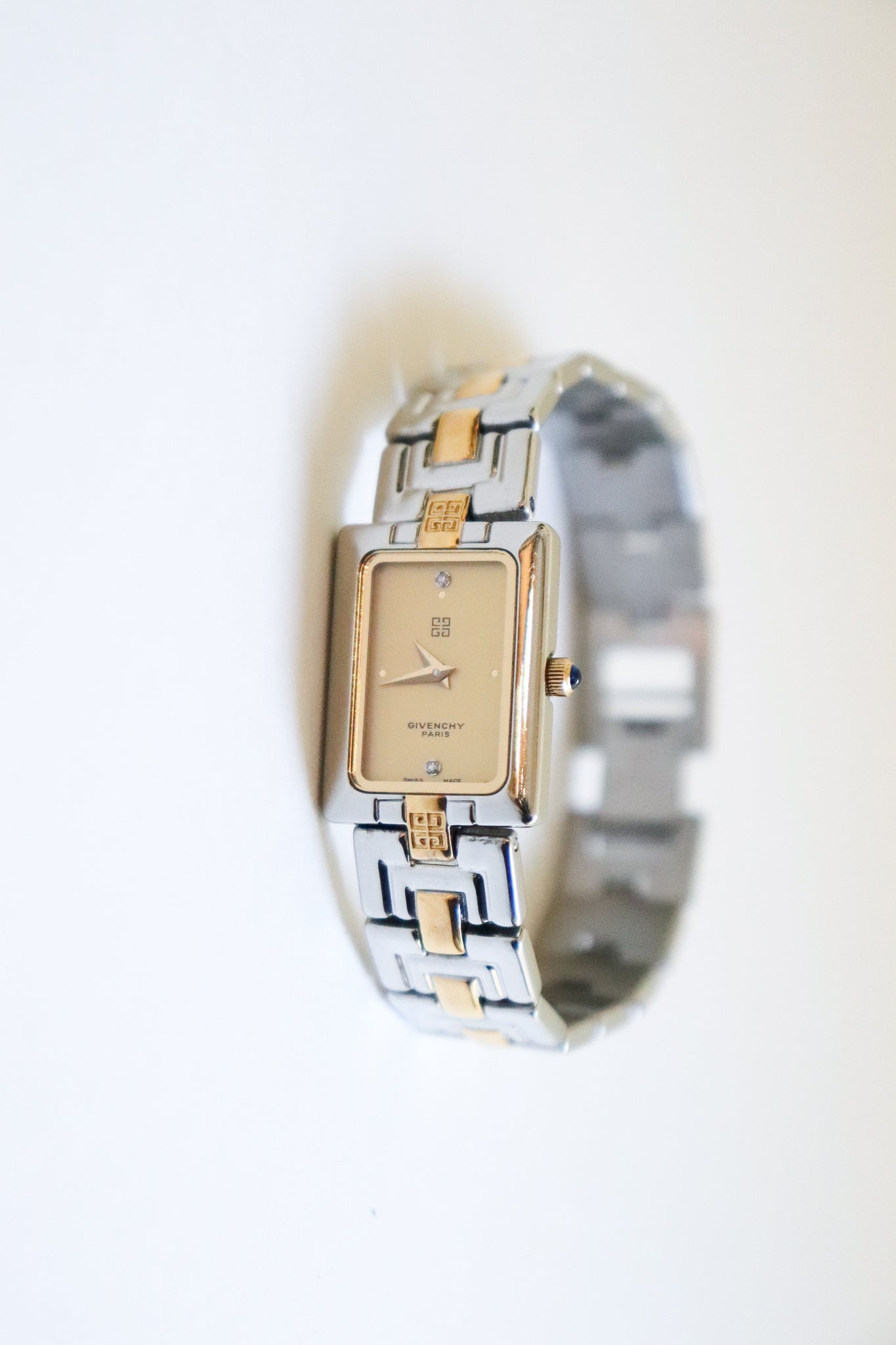A versatile piece that transitions beautifully from day to night — wear it solo for a minimalist statement or stacked with your favorite bracelets for a touch of glam. This vintage Givenchy two-tone watch perfectly blends gold and silver for that effortless 90s elegance. The rectangular dial, accented with two sparkling crystals, gives it a refined yet modern edge.